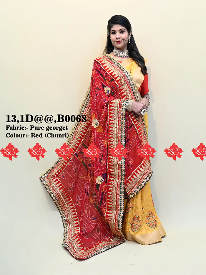 This unique Pure Georgette Red Bandhej odhna rajasthani Embroidered with gotta work. it is also known as Marwadi Rajasthani Marwari Chunri Odhna Dupatta.