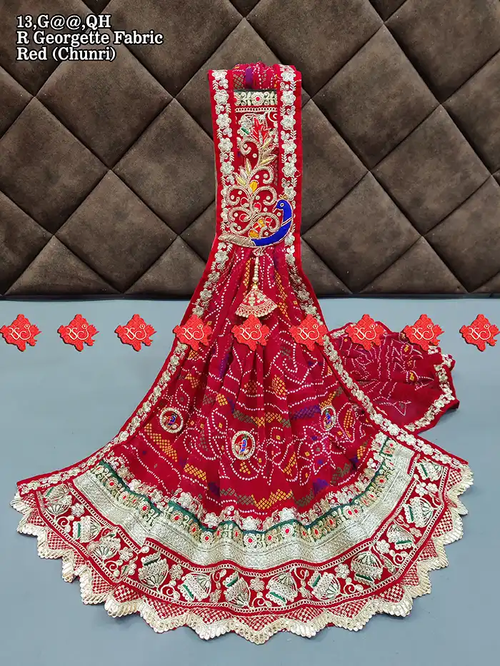 R-Georgette odhna is lightweight, smooth, and flowy, making it more comfortable compared to stiff fabrics. It is often decorated with Bandhej, Gota Patti, Mirror work, or Digital Prints.