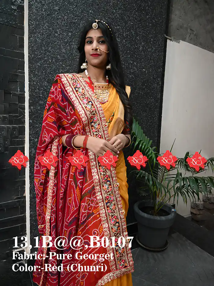 This unique Pure Georgette Red Bandhej pattern Marwari Viscose Rajasthani Designer Chunri Embroidered with gotta work. it is also known as Marwari Viscose Rajasthani Chunri Odhna Dupatta.