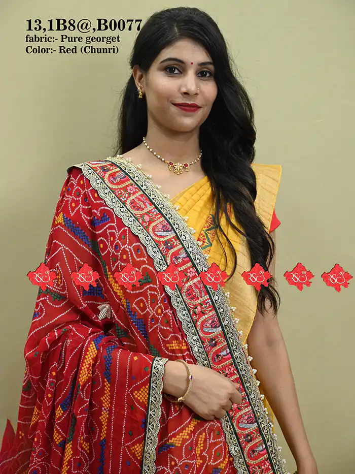 This unique Pure Georgette Red Bandhej pattern Dupatta Embroidered with gotta work. it is also known as Marwadi Rajasthani Marwari Chunri Odhna Dupatta.