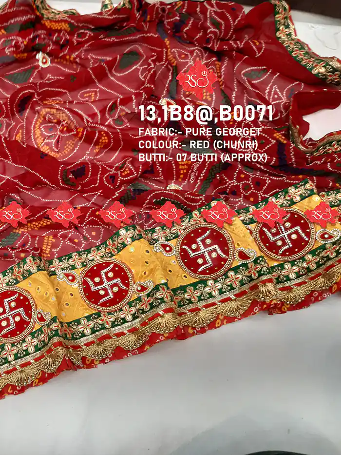 This unique Pure Georgette Red Bandhej pattern Marwari Viscose Rajasthani Designer Chunri Embroidered with gotta work. it is also known as Marwari Viscose Rajasthani Chunri Odhna Dupatta.
