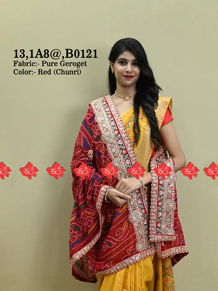 This unique Pure Georgette Red Bandhej pattern Marwari Viscose Rajasthani Designer Chunri Embroidered with gotta work. it is also known as Marwari Viscose Rajasthani Chunri Odhna Dupatta.