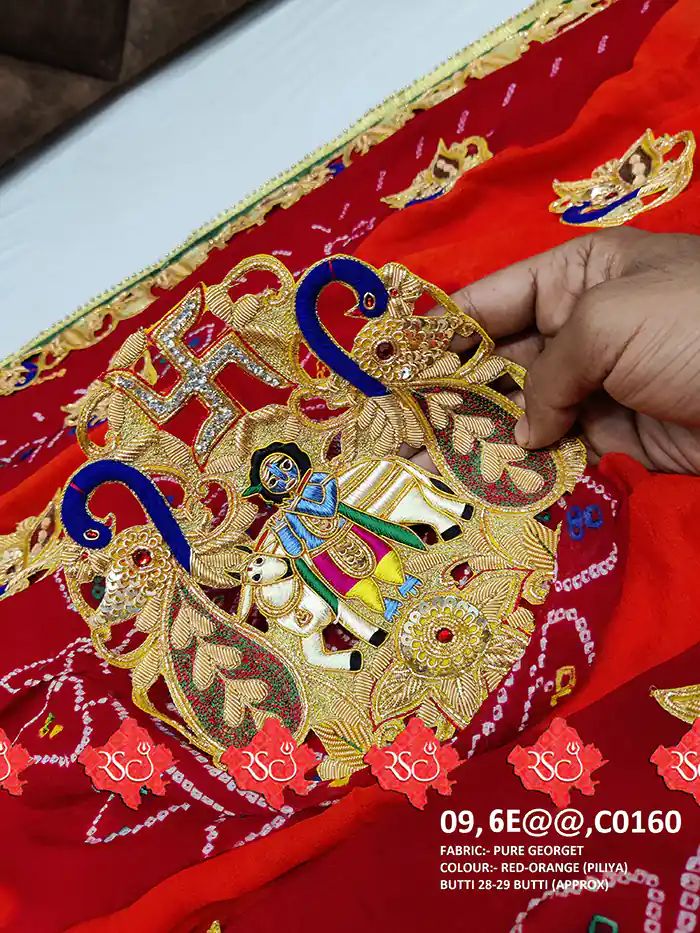 Premium Zardoshi work Bridal Belbutti Odhna is a signature piece of ethnic fashion that reflects authentic Marwari culture. Designed by Ranisatiya Creation, this odhna is perfect for traditional occasions such as weddings, religious ceremonies, and cultural festivals.The forhead belll-butti size in the Odhna will be 1 meter .
