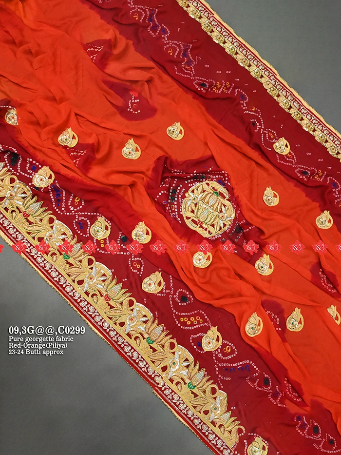 नोट : “1½ (डेढ़ पार्ट)” Pure Georgette/Ojariya का अर्थ है कि यह पारंपरिक रूप से एक और आधे भाग के कपड़े को जोड़कर बनाया जाता है।