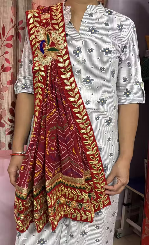 The Synthetic chunri showcases authentic Marwari designs — intricate bandhani (tie-dye) patterns in rich, traditional colors like deep reds, bright yellows, and royal blues. Each piece is handcrafted by skilled artisans, preserving the centuries-old technique that symbolizes the culture and spirit of the Marwari community.