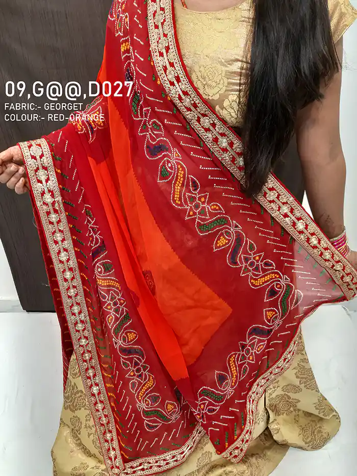 The Designer Pure georgette Odhna showcases authentic Half part odhna Marwari designs traditional colors like deep reds, bright yellows, and royal blues. Each piece is handcrafted by skilled artisans, preserving the centuries-old technique that symbolizes the culture and spirit of the Marwari community.