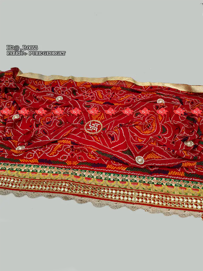 This unique Pure Georgette Red Bandhej pattern Marwari Viscose Rajasthani Designer Chunri Embroidered with gotta work. it is also known as Marwari Viscose Rajasthani Chunri Odhna Dupatta.