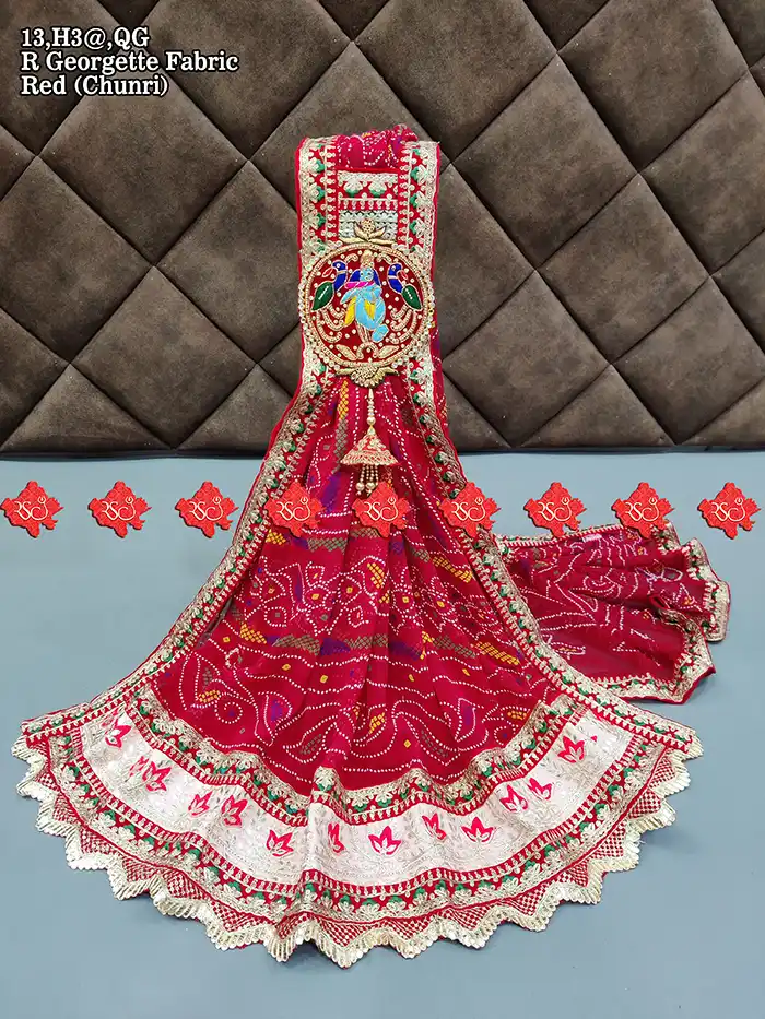 R-Georgette odhna is lightweight, smooth, and flowy, making it more comfortable compared to stiff fabrics. It is often decorated with Bandhej, Gota Patti, Mirror work, or Digital Prints.