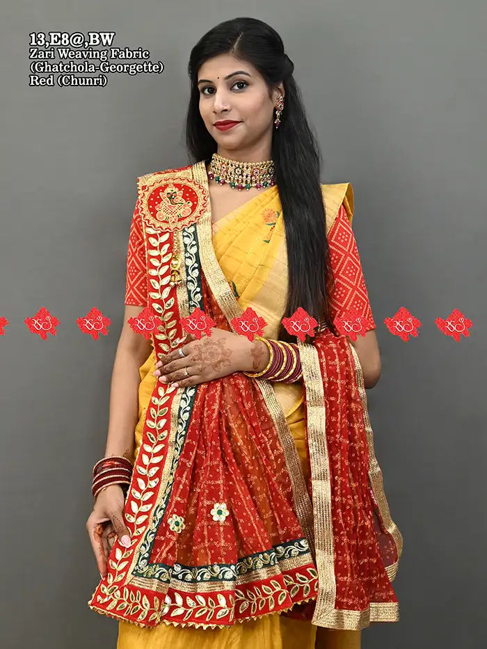 This unique zari weaving plated odhna Embroidered Dupatta with gotta patti work, with beautiful hand made made Butta on shoulder. it is also known as Rajasthani Marwari Odhna Dupatta