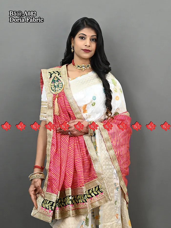 The Doria Fabric Odhna showcases authentic Half part odhna Marwari designs traditional colors like deep reds, bright yellows, and royal blues. Each piece is handcrafted by skilled artisans, preserving the centuries-old technique that symbolizes the culture and spirit of the Marwari community.